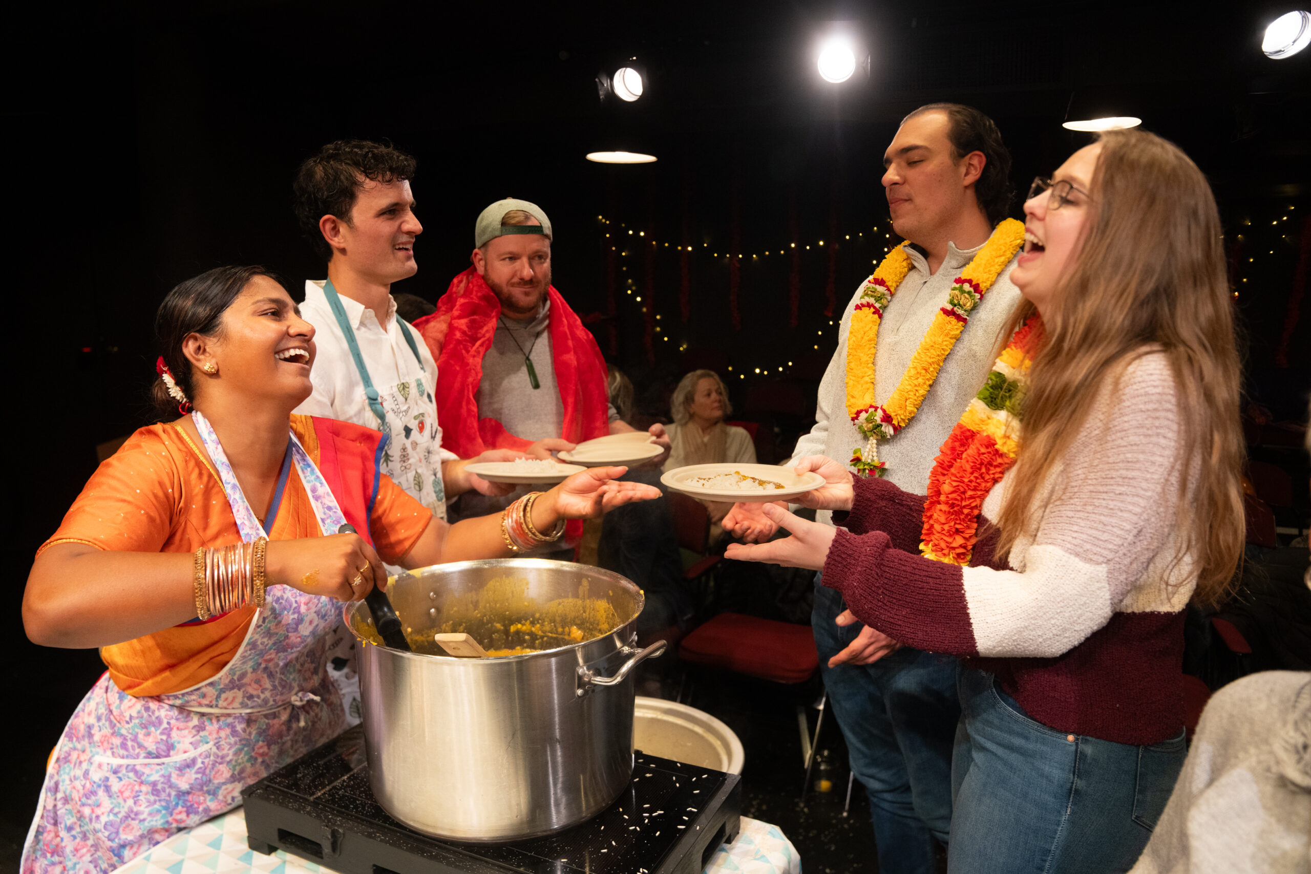 Regional Reviews: Mrs Krishnan’s Party January 16th, 2026 By: Richard T. Green Some things translate into any culture–joy, perseverance, and the hard truths we face along the way. In the immersive comedy Mrs. Krishnan’s Party, now in the Steven Woolf Studio Series at The Repertory Theatre of St. Louis, a very disciplined Indian shopkeeper and her goofy, college-aged boarder run into them all at once. It’s a wonderful experience on every level. This production is traveling around the U.S. from New Zealand, originally created by Justin Lewis and Jacob Rajan and directed by Justin Lewis for Indian Ink Theatre Company. It stars the same two actors from the first staging, Kalyani Nagarajan and Justin Rogers (as Mrs. Krishnan and her boarder James), and is a sequel to Krishnan’s Dairy, which was about Mrs. Krishnan’s husband, set about 20 years earlier and written and performed by Mr. Rajan. Mrs. Krishnan’s Party premiered in August, 2018 at OneOneSix in Whangārei, New Zealand, before first touring that nation. The show successfully relies on a lot of funny audience interaction, creating warm emotional bonds within the theater. The performers’ clever ad libs were intricately woven in to the story the night I went, though you also have the option of sitting farther back in the “wallflower” section if you don’t want to be part of that in a direct way. As Mrs. Krishnan, the splendid Ms. Nagarajan is plunged into a surprise party on the occasion of an Indian feast of diaspora, during her regular work day. There’s a growing sense of pandemonium, thanks to James (the irresistible Mr. Rogers), the college student who rents space from her. These two forces, order and chaos, dance together throughout the 90-minute comedy. Nearly hiding in the shadow of all this is an old Indian folktale that suddenly strikes a familiar political chord: a demon has fooled the great Hindu god Vishnu into giving her controlnot just of the Underworld, but of this world, too. And now that powerful deceiver seems poised to lay siege upon Heaven itself. The end of all of that may come as a huge relief to approximately half the audience in this American tour. Mrs. Krishnan, a humble woman of noble instincts, faces a growing identity crisis as investors seek to take over her family shop. John Verryt’s set is charming under the atmospheric lighting of Jane Hakaraia, with lots of stirring dance music in the sound design by Lia Kelley. Mr. Rogers, as the earnest young James, is as impish as any Hindi deity, drawing us into funny new moments. To maintain the illusion of a surprise party, there is no curtain speech or recorded announcement before the show that would gently warn against the recording of intellectual property. And of course, you’d think by now people would already know not to hold up their phones up to grab a memory of it all from the audience, during a live performance, warning or no. But some things translate into any culture. And this show is such a delight that the “guests” around me were swept up, eager to capture great moments together on opening night.